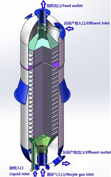 循環(huán)換熱分離器應(yīng)用于煤制油裝置費(fèi)托合成單元,將來自反應(yīng)器的高溫油氣經(jīng)與循環(huán)氣換熱冷卻并分離,分離后的液相重質(zhì)油經(jīng)加熱后送至汽提塔,分離后的氣相高溫油氣進(jìn)入油氣空冷器冷卻。循環(huán)換熱分離器整合了板殼式換熱器高效傳熱與高效分離器高精度分離技術(shù),采用防堵塞專用板型,傳熱效率高、分離精度高、傳熱與分離功能二合一,節(jié)省占地與配管空間。循環(huán)換熱分離器為首創(chuàng)產(chǎn)品,依托400萬噸/年煤間接液化成套技術(shù)創(chuàng)新開發(fā)及產(chǎn)業(yè)化項(xiàng)目榮獲2020年度國家科學(xué)技術(shù)進(jìn)步一等獎(jiǎng)。