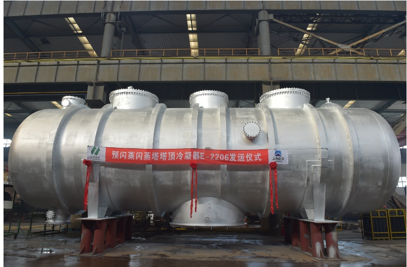 大型板殼式塔頂冷凝器采用安全回轉(zhuǎn)殼內(nèi)裝傳熱板束,選用高效不等間距板式傳熱元件;熱側(cè)氣相采用短流程寬通道,壓降?。焕湓磦?cè)采用窄通道長流程通道,強(qiáng)化傳熱;殼內(nèi)設(shè)置分離腔實(shí)現(xiàn)氣液相分離。大型板殼式塔頂冷凝器可集成預(yù)閃蒸塔與閃蒸塔所需冷凝器于一體,實(shí)現(xiàn)真空工況塔頂氣相大流量介質(zhì)的冷凝、冷卻。
